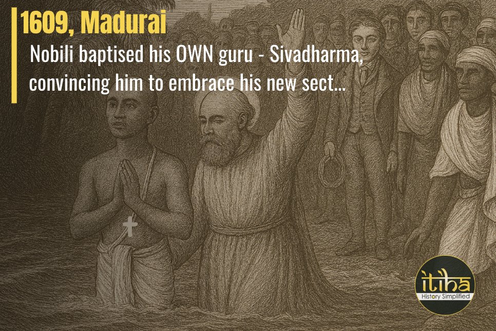 Once he understood Indian traditions, Nobili rebranded Christianity through a Hindu lens. He equated Christian concepts with familiar Hindu terms: God became “Brahman,” salvation was seen as “Moksha,” and Christian grace was presented as “Prasadam.” He even called parts of the Bible the “Yesur Veda” (the Veda of Jesus), and the church became a “Kovil” (temple), while pastors were referred to as “Gurus.”