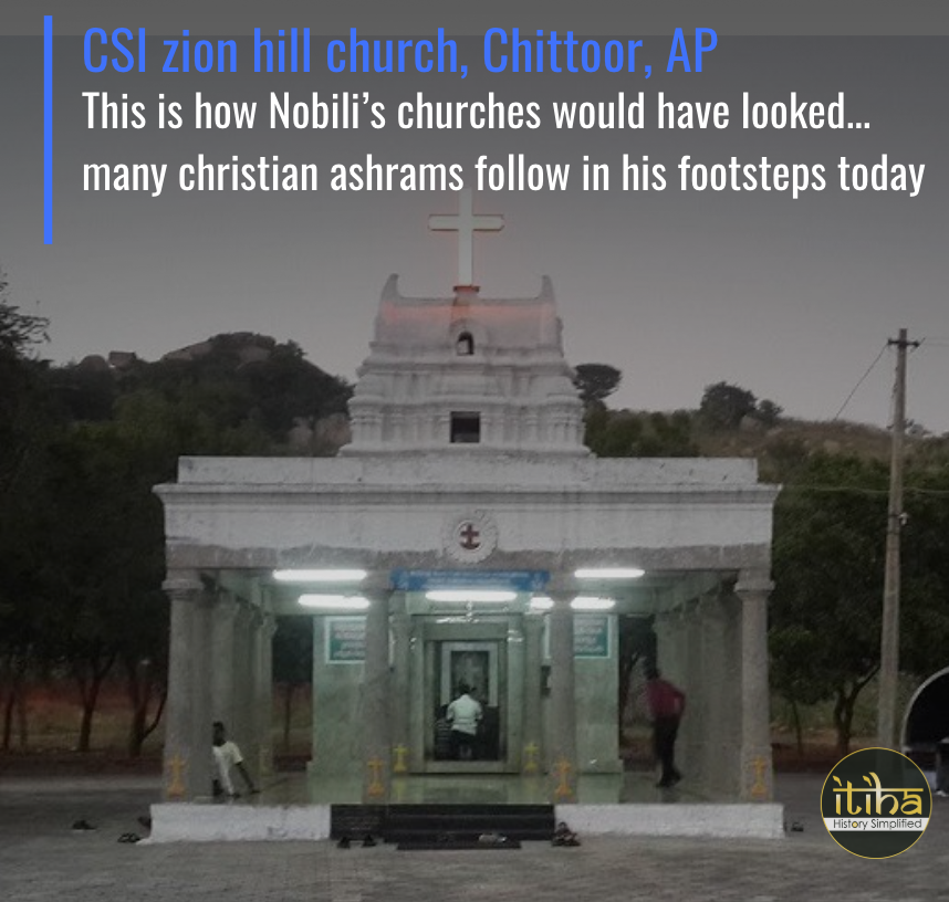 To further his deception, the churches he built resembled Hindu temples, avoiding any European symbols. Converts were allowed to continue practicing Hindu customs such as wearing the sacred thread, performing rituals, and celebrating festivals, as long as they refrained from idol worship. He even Christianized the sacred thread ceremony (Upanayanam), interpreting the three threads as symbols of the Holy Trinity, with a Christian cross incorporated into the ritual.