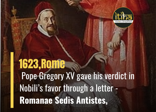 Despite facing opposition both from the local Hindu community and the Church, Nobili continued his mission. The Church initially disapproved of his methods, as they believed he was adulterating Christian teachings. However, Nobili defended his approach by arguing that early Christianity had adapted Greco-Roman culture and rites, and he was simply doing the same in India. Eventually, Pope Gregory XV ruled in his favor, allowing him to continue his work with some restrictions.