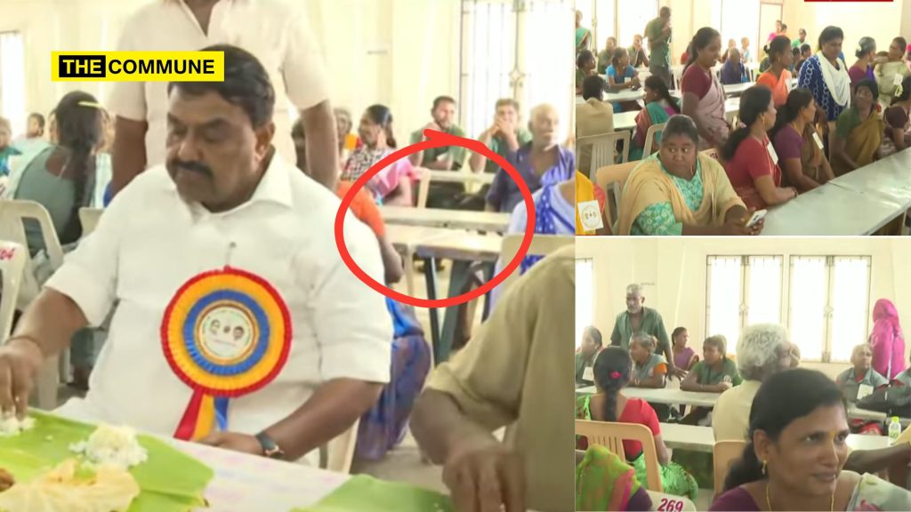 More than 500 sanitation workers were invited to the function to honor their contributions, but instead of receiving equal treatment, they were made to wait over an hour for food. They were also segregated into a separate dining rows and not served until after the officials—including Ramanathapuram MLA and DMK Minister Raja Kannappan—had finished their meals and left the venue. Even in the video footage, while the minister dined comfortably in the front row, the two rows behind—where the sanitation workers were seated—hadn’t even been provided with banana leaves for serving food.