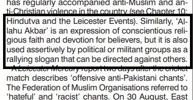 Now contrast this with the report’s softer treatment of the Islamic slogan ‘Allahu Akbar,’ which was also raised during the violence.