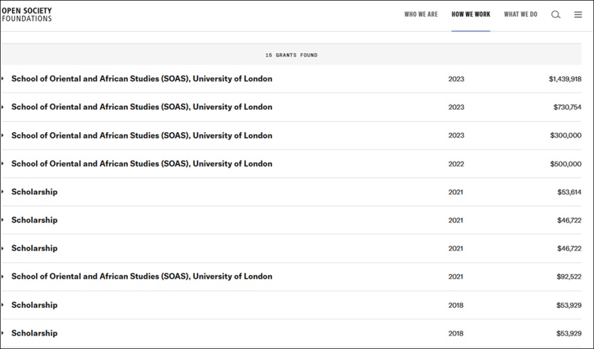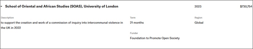 The Open Society Foundations (OSF) is said to have provided significant funding for the report. Records show a grant of $730,754 in 2023 to SOAS to “support the creation and work of a commission of inquiry into intercommunal violence in the UK.”