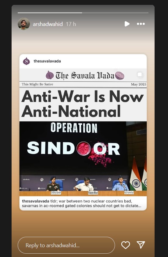 He didn’t stop even after being called out. Instead, he took to his Instagram page and shared a post from the handle “Savala Vada,” which sarcastically claimed, “Anti-war is now anti-national.” Ironically, “Savala Vada” is widely regarded as a propaganda outlet that frequently echoes narratives pushed by media networks known for their anti-India bias—such as Al Jazeera and The Caravan, both of which have often been criticized for promoting agendas contrary to India’s national interests.