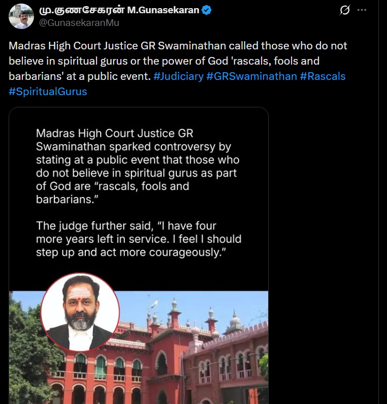 Gunasekaran wrote on social media that “Madras High Court Justice GR Swaminathan called those who do not believe in spiritual gurus or the power of God ‘rascals, fools and barbarians’ at a public event.”