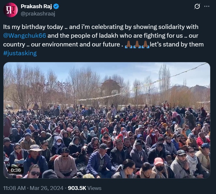 On 26 March 2024, actor and vocal government critic Prakash Raj met Wangchuk in Leh to support his hunger strike for Ladakh’s statehood and inclusion in the Sixth Schedule. Later, on September 27, 2025, Raj protested Wangchuk’s arrest, posting their photo with the caption, “You can cage a bird, but you can’t stop it from singing.”