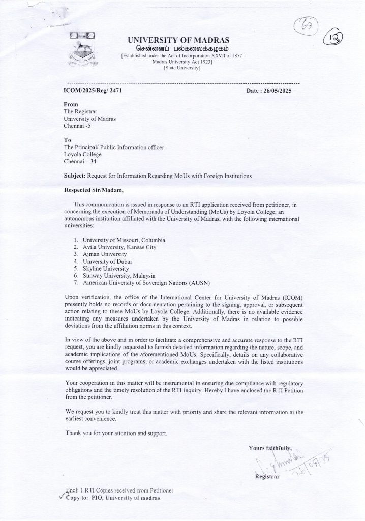 The request was straightforward. Under UGC regulations, affiliated colleges are required to obtain prior approval from their affiliating university before entering into any foreign collaboration. UoM, as the regulatory authority over Loyola College, should have had complete records of each of these MoUs – their terms, their approvals, and their academic outcomes.