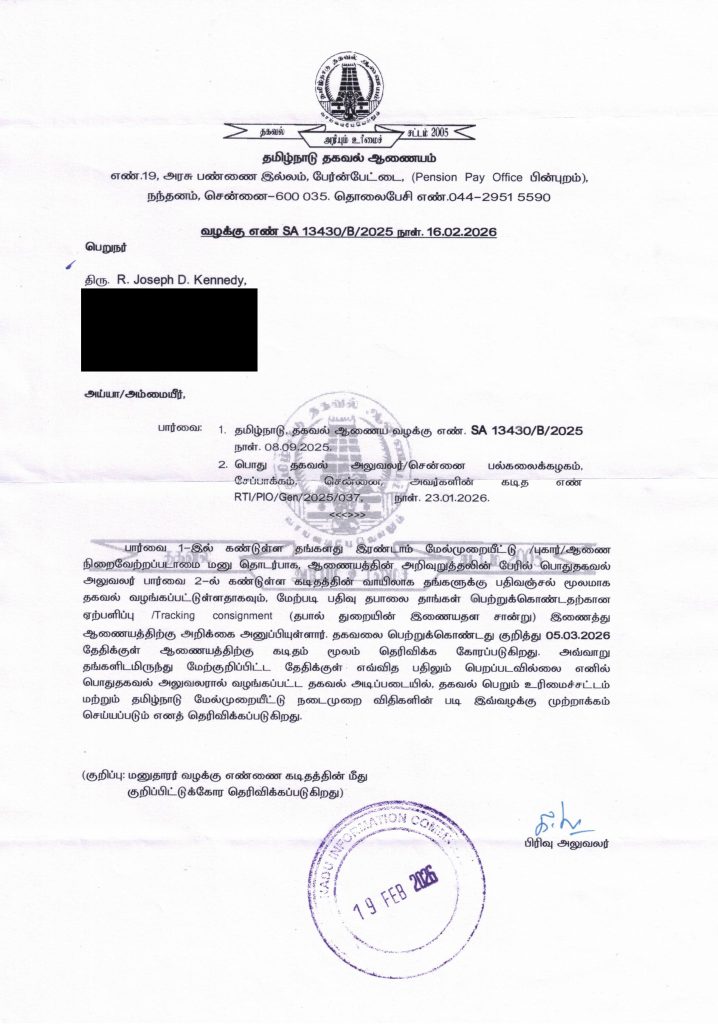 After UoM’s stonewalling, Kennedy escalated the matter to the Tamil Nadu Information Commission (TNIC). In an order dated 16th February 2026, the Commission ruled in Kennedy’s favour in Case No. SA 13430/B/2025, directing UoM to furnish the requested information by 5th March 2026.