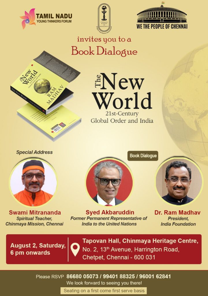 The Tamil Nadu Young Thinkers Forum, in collaboration with Chinmaya Academy of Management and We the People of Chennai, will organize a book dialogue on The New World: 21st Century Global Order and India, authored by Dr. Ram Madhav, President of the India Foundation. The event is scheduled for 2 August 2025 (Saturday) at 6 PM at Tapovan Hall, Chinmaya Heritage Centre, Chetpet.