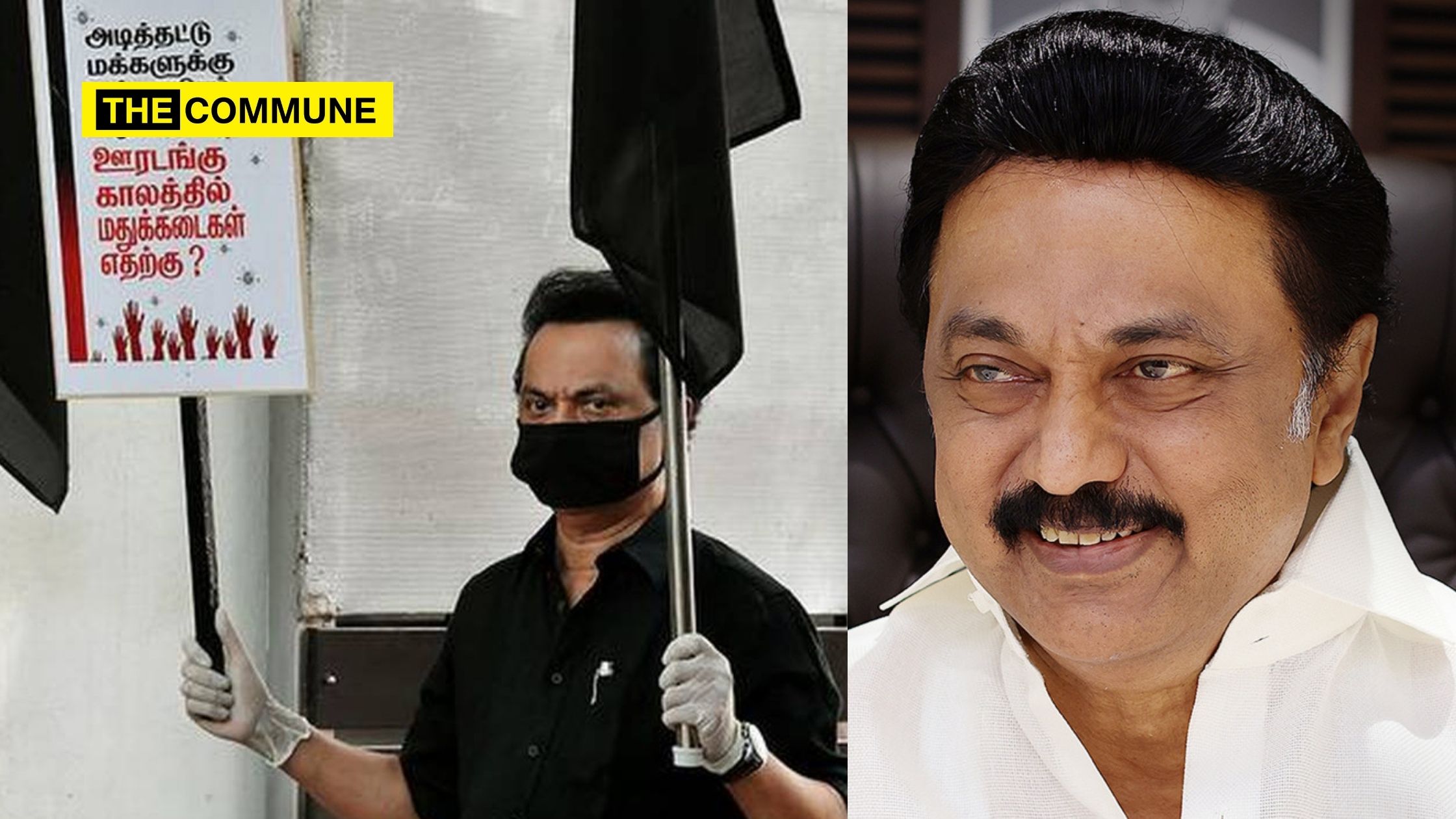 Chief Minister MK Stalin had back then wore a black attire with one hand holding a black flag and another holding a placard with the line “Give 5000 rupees to bottom section of the people. Why open liquor shops during lockdown?”