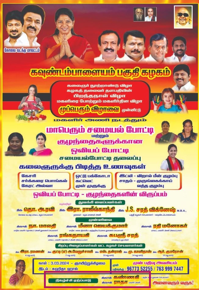 On 5 March 2024, Radha Sivakumar shared on social media details about a recent event organized by the DMK Women’s Wing in Kavundampalayam. Acting on the guidance of Coimbatore North District DMK Secretary T.A. Ravi, the team successfully hosted the ‘Mupperum Vizha celebration. The event was held under the leadership of Kavundampalayam Area DMK Secretary J.S. Sarath Vignesh.