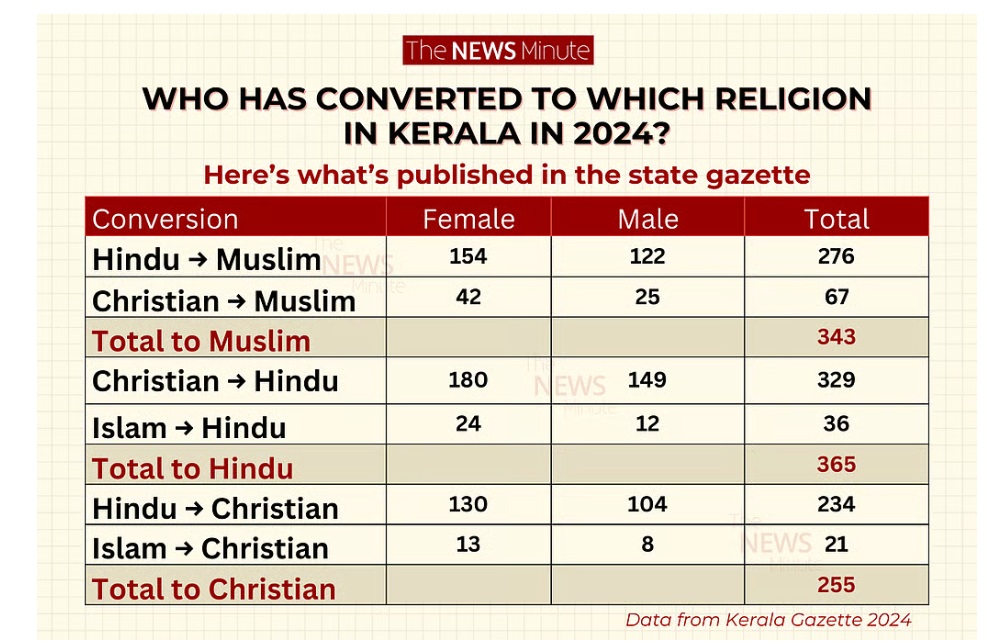 • 365 people converted to Hinduism in Kerala in 2024, making it the biggest gainer in conversions.