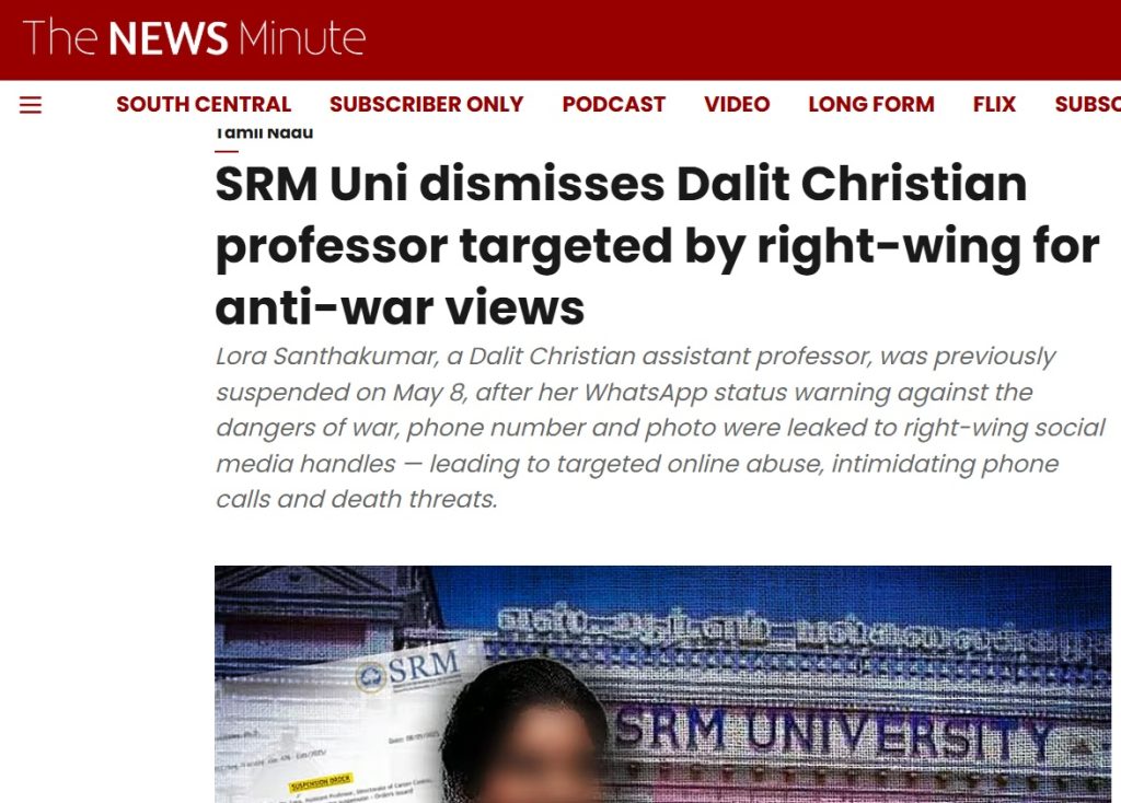 TNM headlined its story as “SRM Uni dismisses Dalit Christian professor targeted by right-wing for anti-war views”, framing the dismissal entirely as a case of caste- and religion-based persecution.