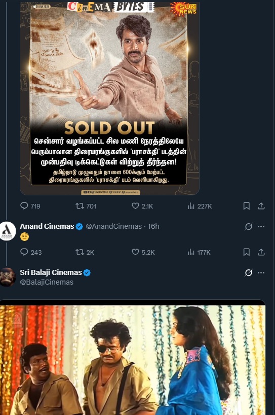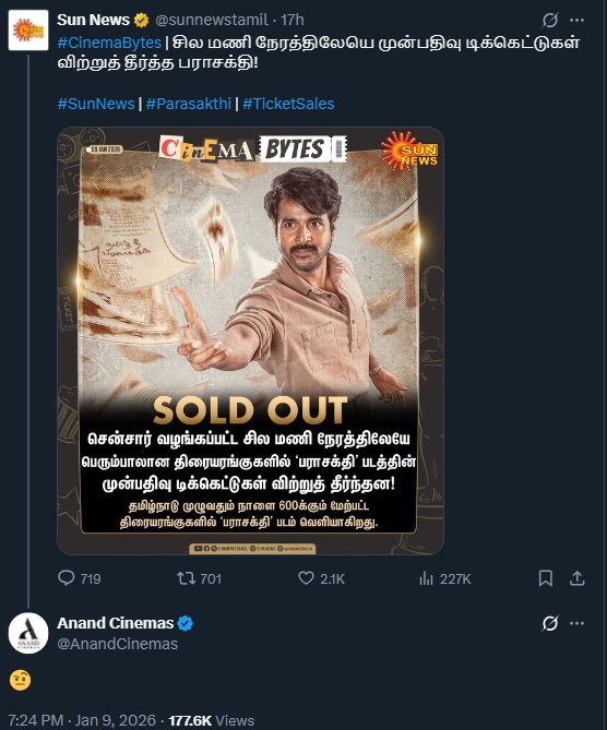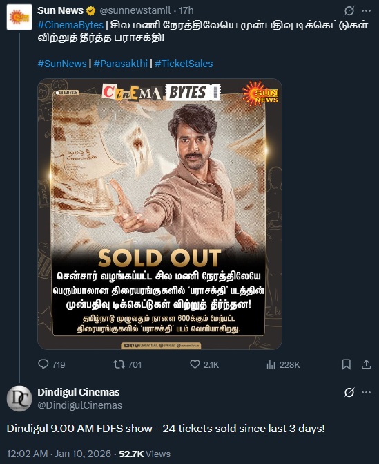 A post by Sun News under its Cinema Bytes segment claimed that early morning shows in Chennai were sold out and projected high demand for the film across Tamil Nadu. The post was widely shared on social media and amplified by several cinema-related accounts.