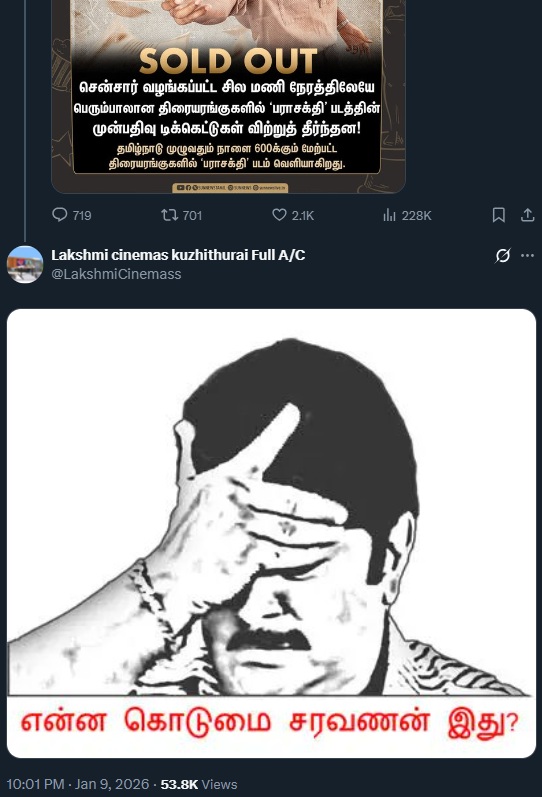 Claims of strong box-office momentum for the 2026 pro-DMK propaganda film Parasakthi came under scrutiny on Friday after multiple theatre owners and social media users challenged “sold out” narratives circulated by DMK mouthpiece Sun News’ X handle.