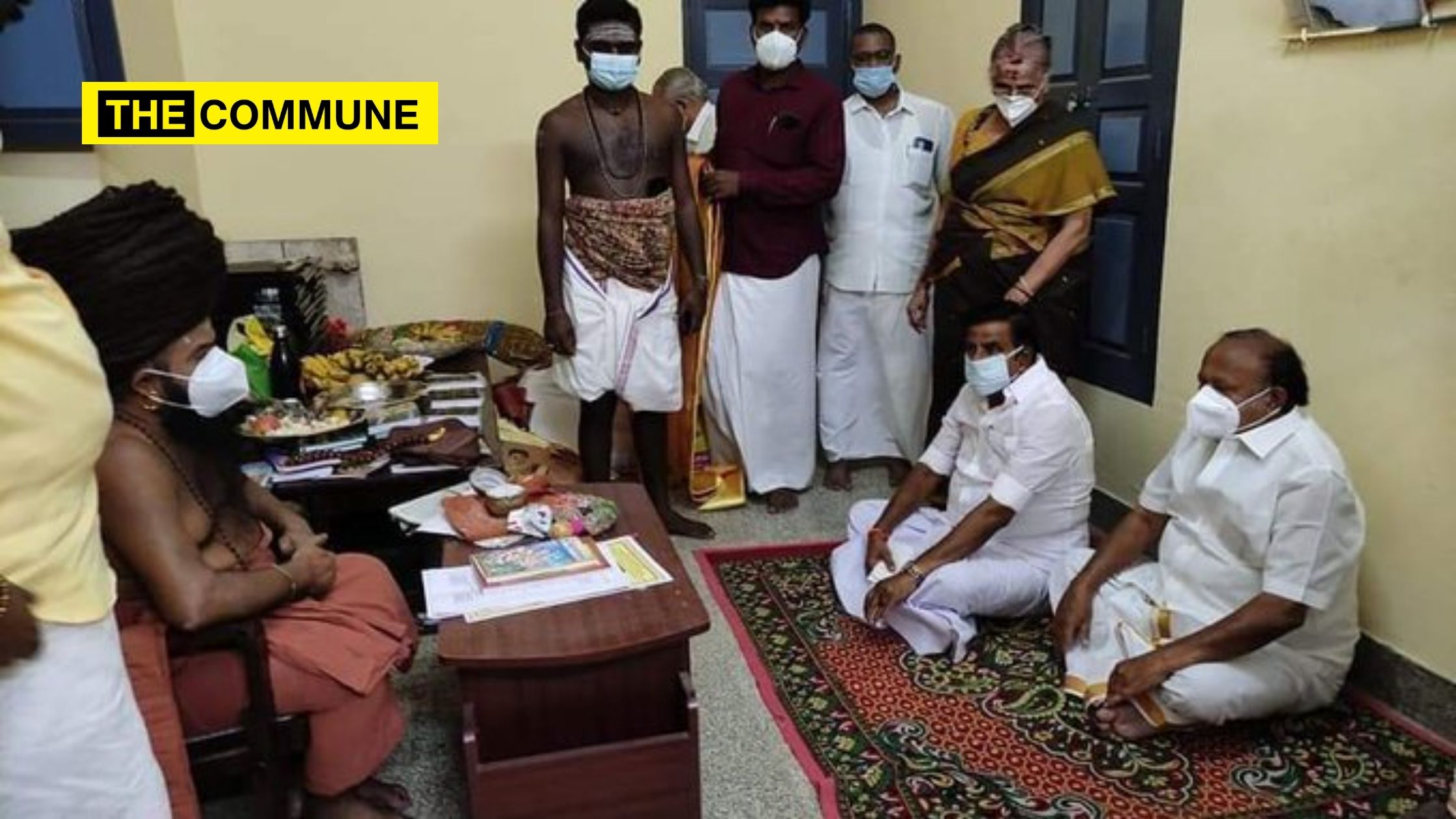 A photo of former ministers of the Dravida Munnetra Kazhagam (DMK) receiving blessings from the 27th Gurumaha Sannidhanam of the Dharumavaram Aadheenam at the Vaitheeswaran Kovil Temple on Thursday has gone viral on social media.