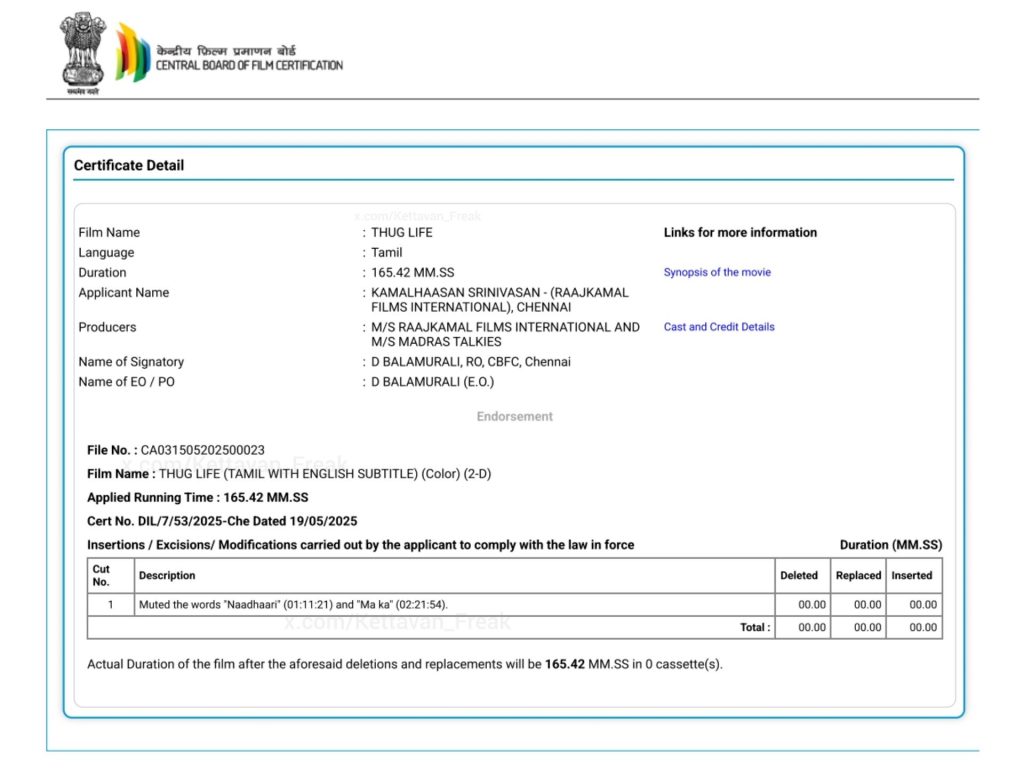 Despite this distasteful, sleazy narrative arc, the Central Board of Film Certification (CBFC) issued Thug Life a U/A (16+) certificate with only two minor mutings of cuss words—allowing it easy access to theatrical releases, satellite deals, and OTT platforms.