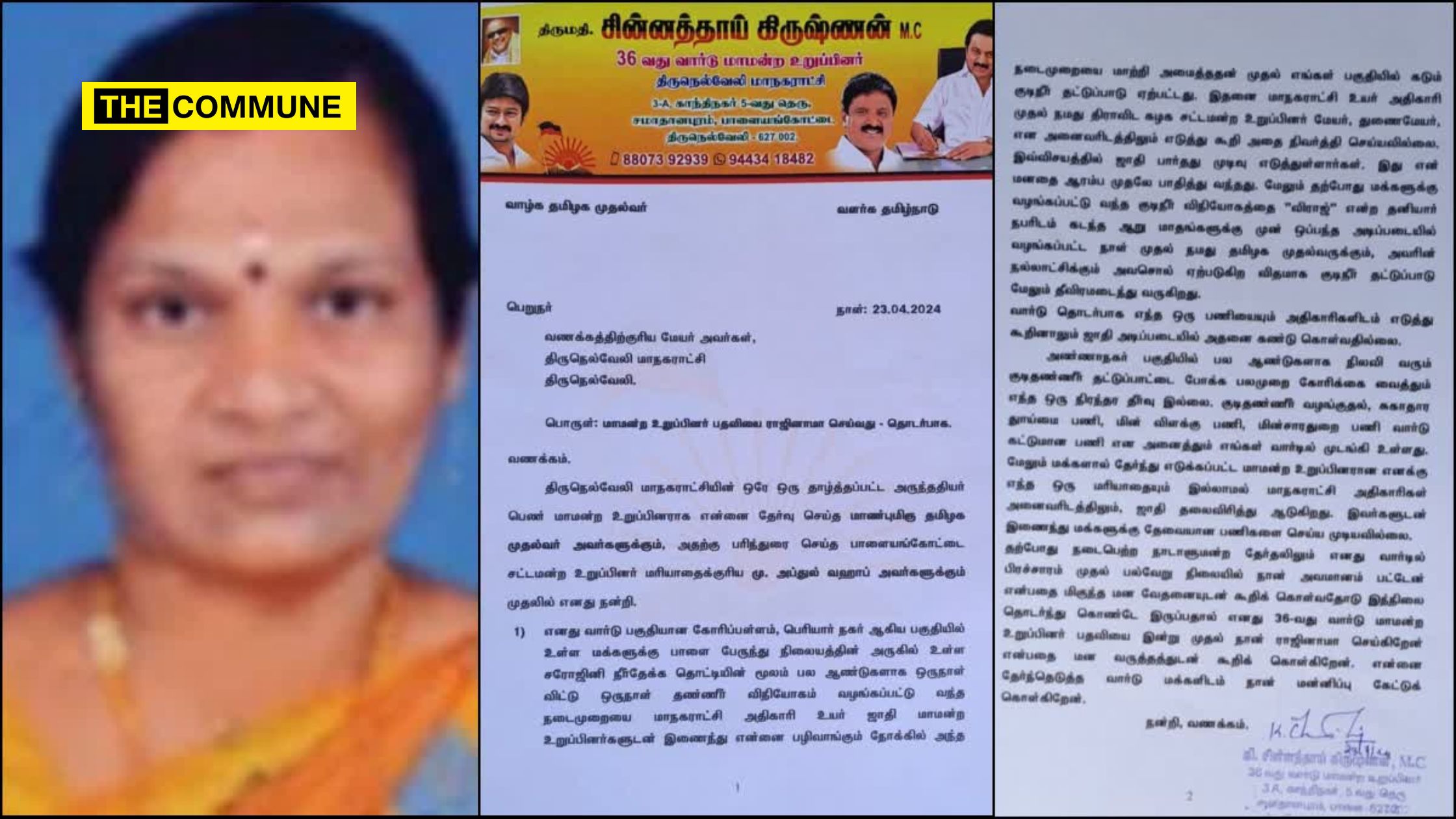 Tirunelveli City Municipal Corporation’s 36th Ward representative, K Chinnathai from the DMK, has formally communicated her intention to step down from his role as a Member of council in a letter addressed to the Mayor. In her correspondence dated on 23 April 2024, she highlighted caste-based discrimination prevalent in the management of drinking water distribution in her ward, attributing it to the privatization of the public water supply contract six months ago.
