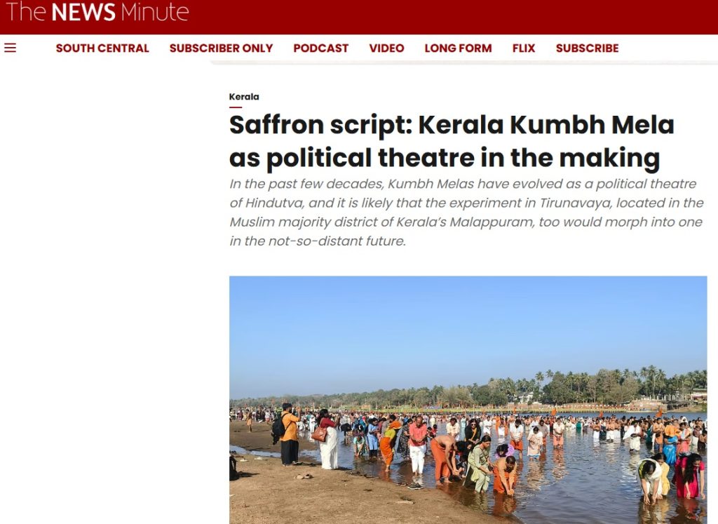 In the piece, Karunakaran calls Tirunavaya’s Maha Magha Mahotsavam a “saffron script” and “political theatre of Hindutva,” warning it will morph into a full Kumbh Mela to polarize Kerala ahead of 2028 elections.