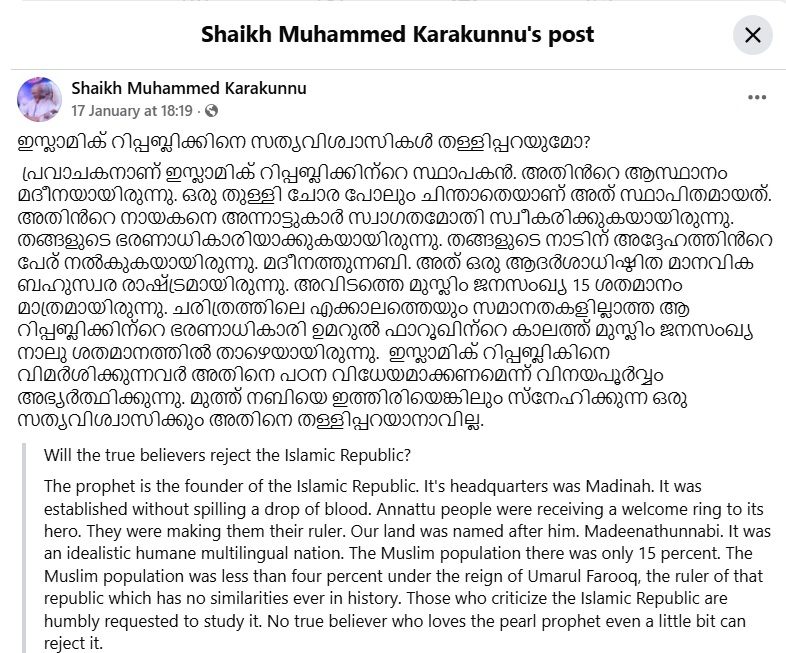 In a Facebook post titled “Would true believers reject Islamic Republic?”, published on 17 January 2026, Karakunnu stated that the Prophet Muhammad was the founder of the Islamic Republic and that its capital was Medina. He said the state was established without the shedding of blood and that the people of the land welcomed the Prophet and accepted him as their ruler, naming the city Madinatun Nabi (City of the Prophet). He described it as an ideal-based, humanitarian and pluralistic polity, claiming that Muslims constituted only about 15 per cent of the population at the time.