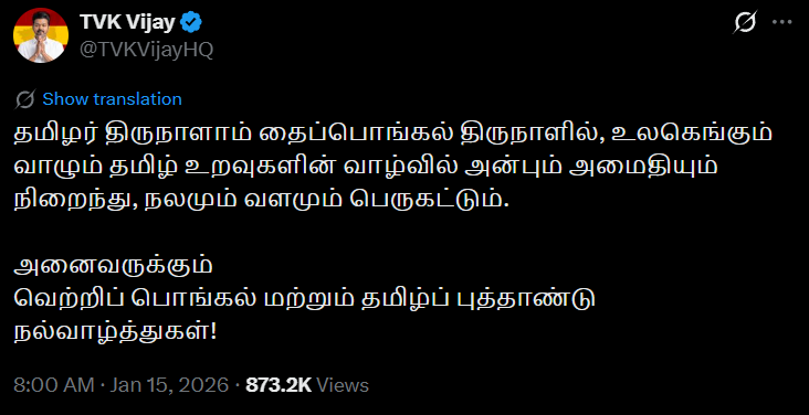 — TVK Vijay (@TVKVijayHQ) January 13, 2025