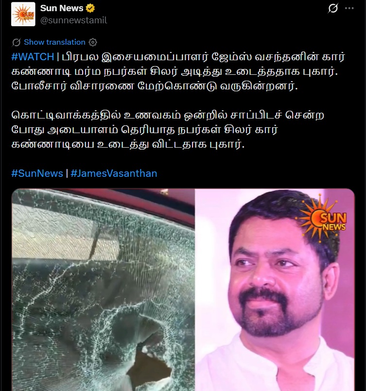 Alleged music director James Vasanthan on Sunday, 26 April 2026, alleged that unidentified persons smashed the rear window of his car on East Coast Road (ECR) in Chennai, and hinted that the act may be linked to his recent confrontations with TVK supporters during a debate.
