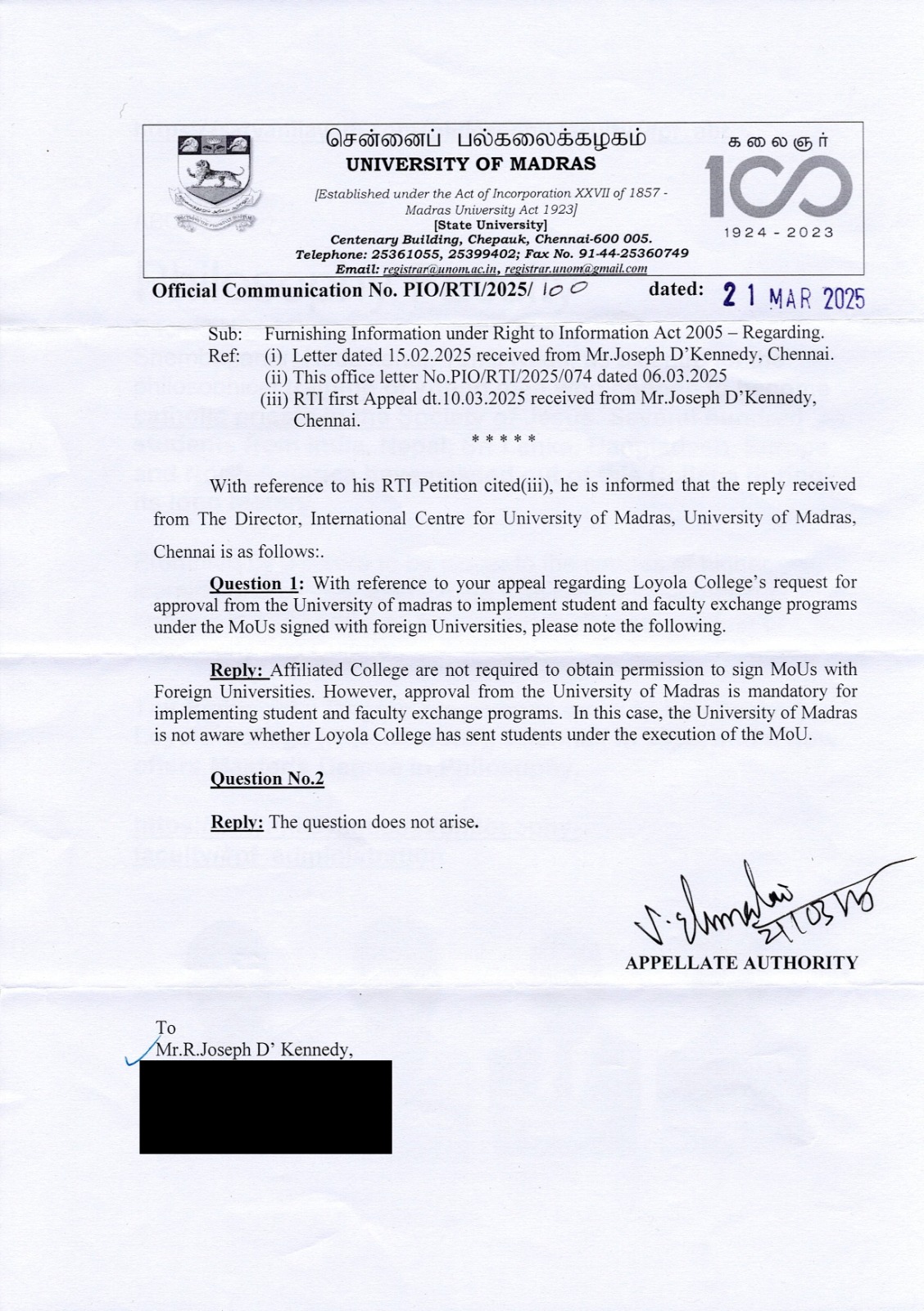 The reply, received after a first appeal on March 21, 2025 (Ref: PIO/RTI/2025/100), was startling in its vagueness. While the University of Madras admitted that approval is mandatory for student and faculty exchange programs, it claimed it was “unaware” whether Loyola had ever executed such exchanges — despite the college’s official Loyola International Academic Collaborations (LIAC) portal and brochures openly advertising these partnerships.