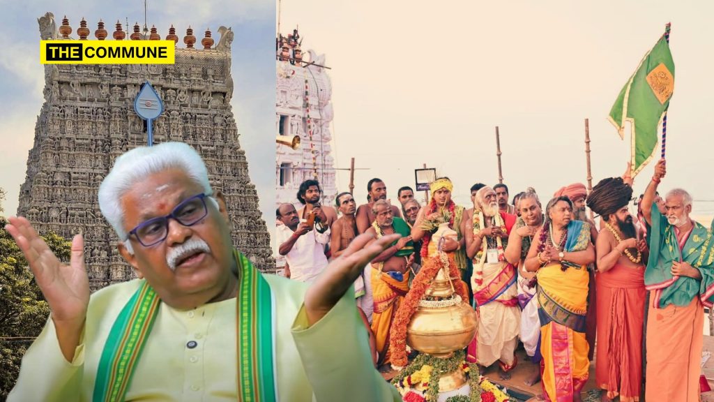 “What does ‘Kudamuzhaku’ mean? That is, a Sivachariyar performs that ritual in a particular method. If you think even deeper, Vaidikas do not have respect for these Agamas. The Vaidika tradition, which is the Vedic tradition, does not respect the ritualistic tradition of the Sivachariyars. Today, everyone just comes together for a show on the surface. Why is this not respected? Because, for them, God has no form. He can only be invoked in the sacrificial fire (Yagna Agni). Once he appears in the sacrificial fire, offerings and oblations must be given to him, and then he will depart. He does not have a temple or a specific place of his own. They might feel bad if told, but Vaidikas are immigrants from outside, so they do not have land. Those who do not have land do not have temples. Those who do not have temples do not have idols. Those who do not have idols do not have idol worship. Is this the history?” he asks.