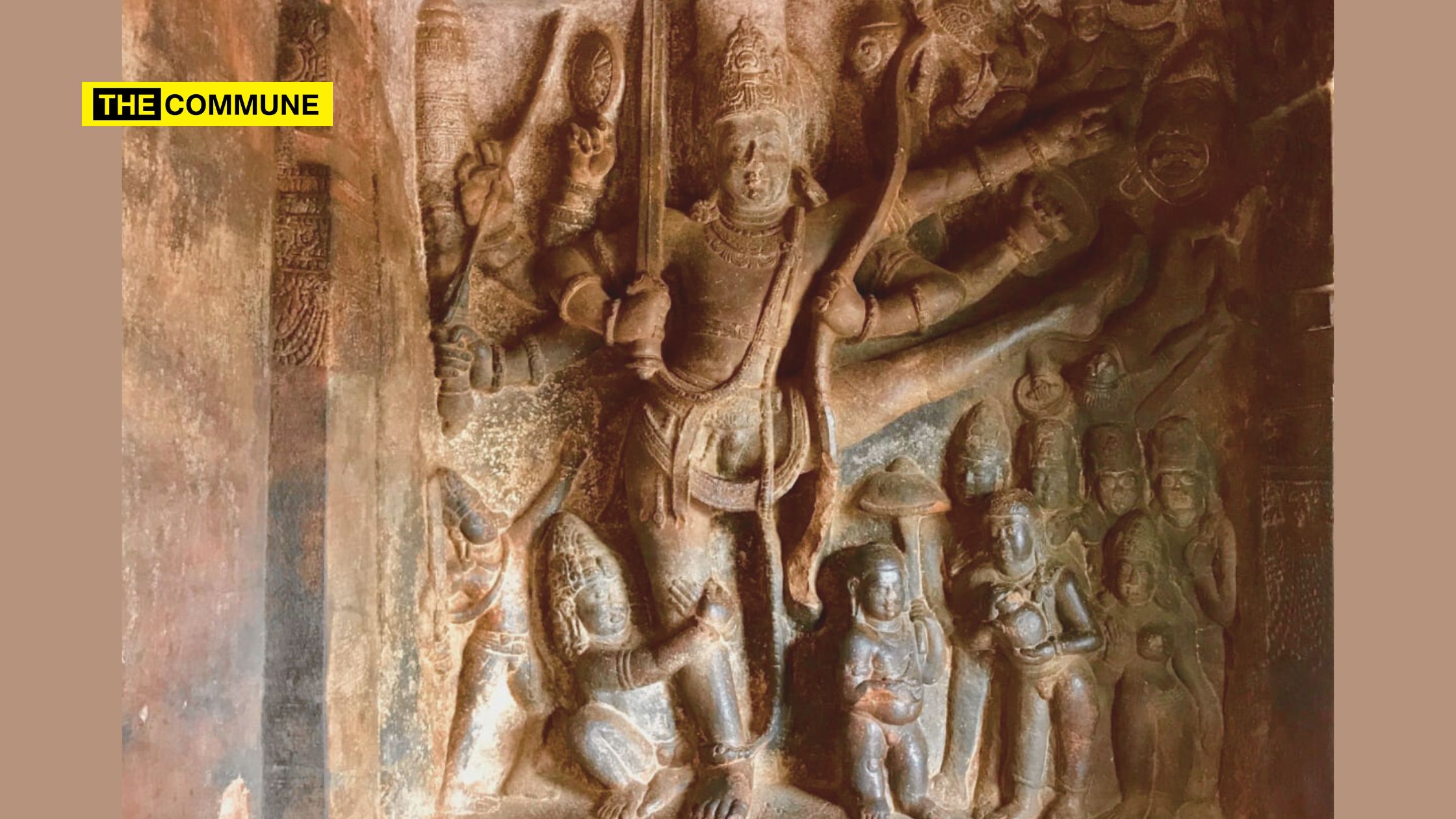 The 8th Century sculpture at cave no. 15 in the Dasavatara cave complex is yet another notable representation of Trivikrama. The typical features of Eight hands, leg raised upto the navel are depicted wheras the sword held sideways along the hip stands out as a unique feature. Similar to the art of Badami, Mahabali and his queen gifting Vamana finds its depiction here too, showing continuity.