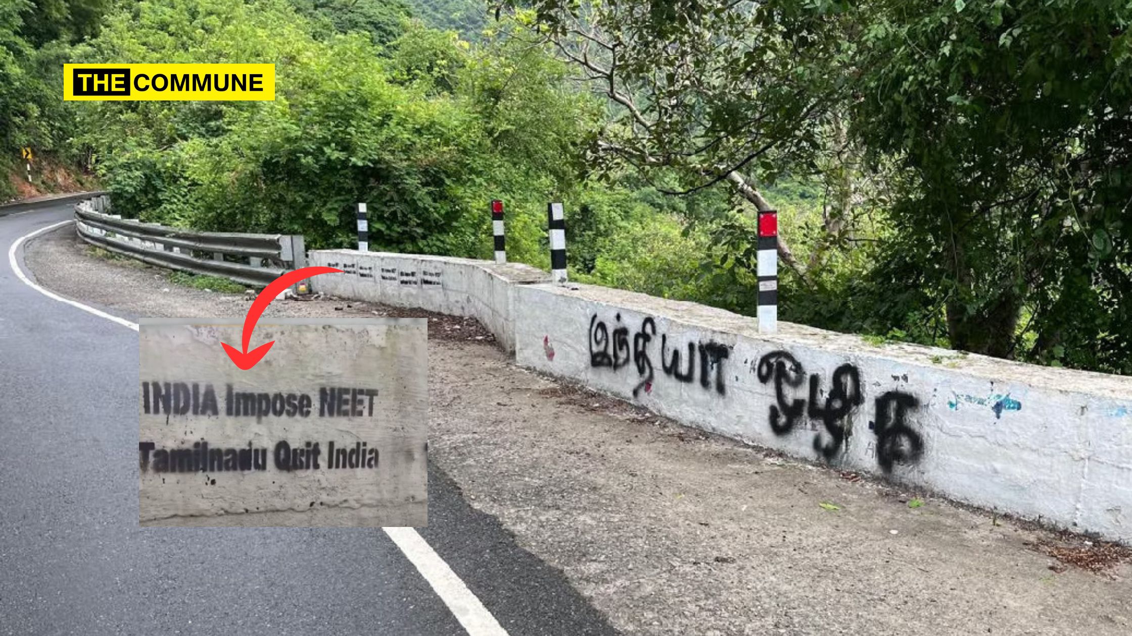 Anti-India slogans were found on the crash barriers installed along the Mettupalayam and Kotagiri Road. One illegally painted graffiti in English read, “India impose NEET. Tamil Nadu Quit India,” while another in Tamil stated, “Down with India” (India Ozhiga). A concerned citizen captured this etching on video and shared it on social media, causing it to quickly gain viral. Police have been urged to take immediate action in response to this incident.