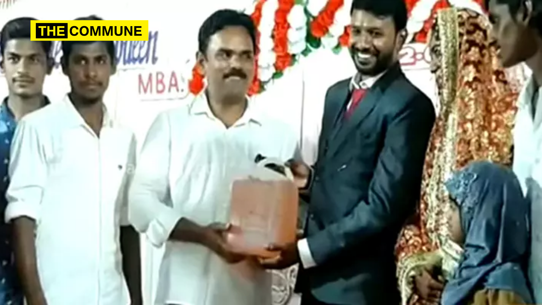 Unlike usual wedding gifts, a newlywed couple in Salem got the surprise of their lives when a relative gave them petrol as a wedding gift. The wedding ceremony of Mohammad Rahbathin and Jabsoom Nazia took place in the Salem Fort area. Relatives and friends who came to the wedding greeted the bride and groom by giving them various gift items.