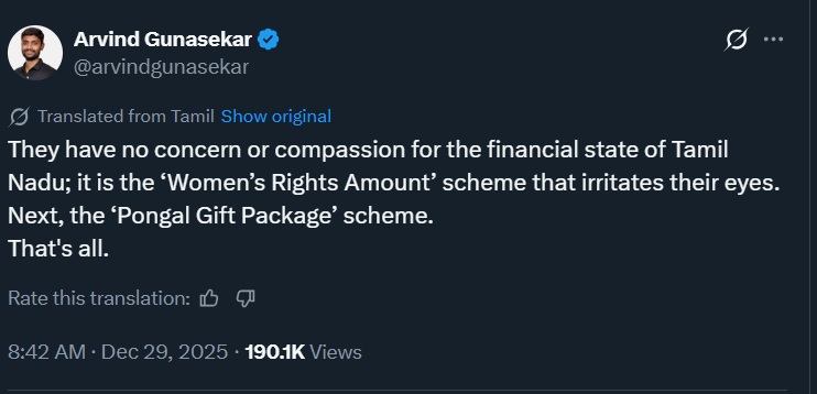 On December 29, 2025, so-called journalist Arvind Gunasekar, a known Dravidianist/DMK supporter, wrote: “They have no concern or care for Tamil Nadu’s financial condition. The ‘women’s entitlement allowance’ scheme irritates them.