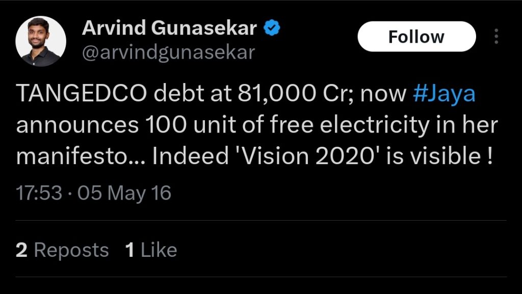 In 2016, when the AIADMK government announced pre-election welfare measures, the same journalist had no hesitation in mocking the move. At the time, he wrote: “TANGEDCO debt at 81000 cr; now Jaya announces 100 unit free electricty in her manifesto… indeed ‘vision 2020’ is visible!”
