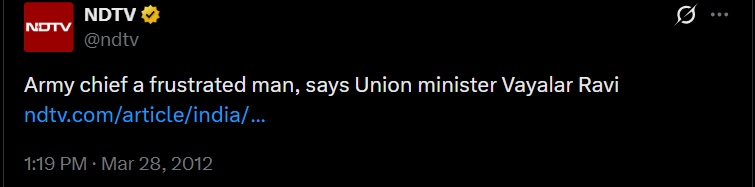 Union Minister Vayalar Ravi publicly dismissed the Army Chief outside Parliament, saying: “The Army is a disciplined force. (He) could not get an extension even by the court. May be a frustrated man suffers.” He labelled it the “action of a frustrated individual.”