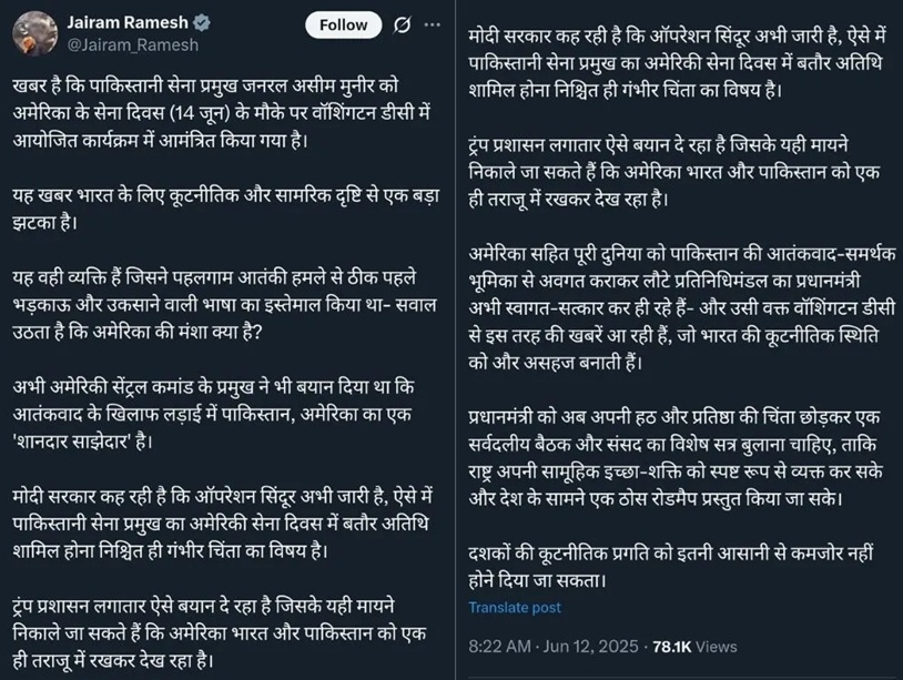The Congress party has once again found itself mired in controversy, accused of prioritizing political opportunism over national interest. Senior Congress leader and Member of Parliament Jairam Ramesh recently shared a misleading claim on social media platform X, alleging that Pakistan Army Chief General Asim Munir was invited to the U.S. Army Day parade in Washington, D.C. Ramesh suggested this was a diplomatic failure for India and a blow to Prime Minister Narendra Modi. However, the narrative quickly unraveled when the White House clarified that no such invitation had been extended, exposing the claim as false.
