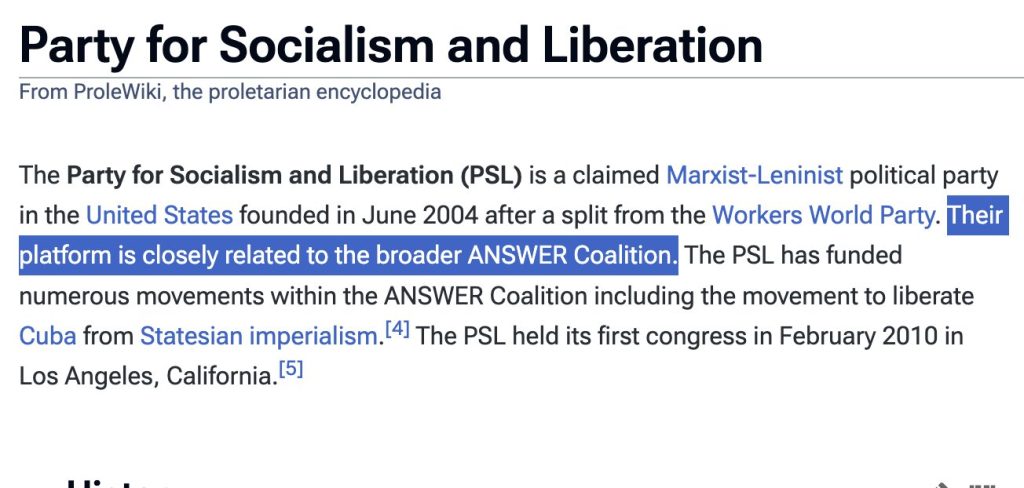 While PSL is not a registered nonprofit and hides its funding sources, its protests often coordinate with nonprofits such as ANSWER Coalition, an anti-imperialist group with similar ideological leanings.