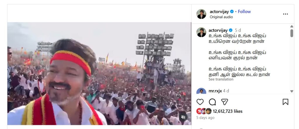 While Vijay’s Instagram post from August 2025 boasting 12.5 million likes was touted as a record-breaking feat, digital analysts and political observers weren’t convinced. Despite having just 14.1 million followers, the video a simple selfie from a political rally received more likes than posts by global celebrities like Cristiano Ronaldo and Virat Kohli.