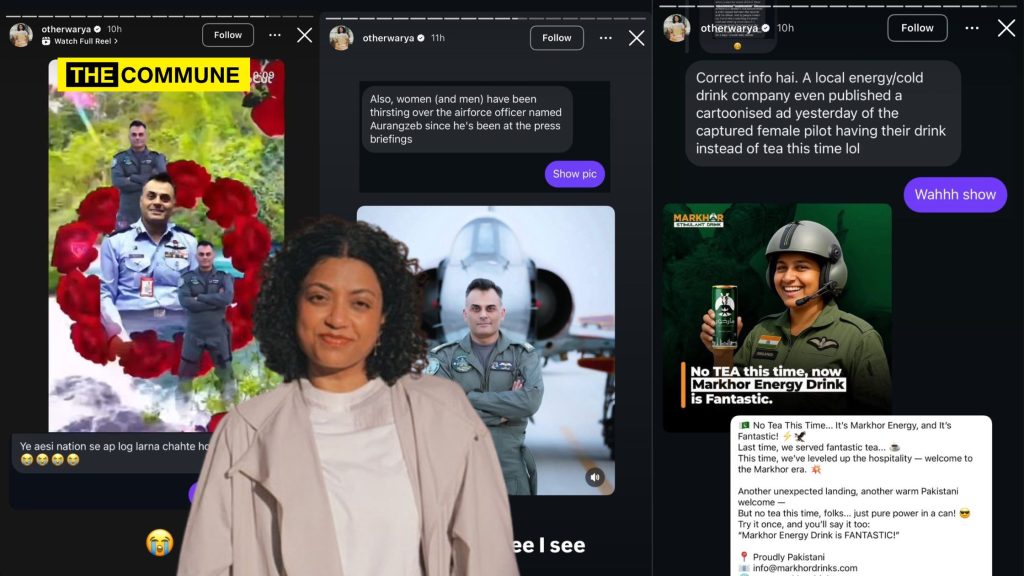 The second story read: “Also, women (and men) have been thirsting over the airforce officer named Aurangazeb since he’s been in the press briefings .” @otherwarya responded with repeated “I SEE” texts, implying agreement with the sentiment.