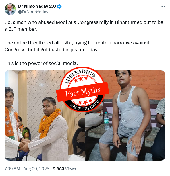 In August 2025, at a Congress rally in Darbhanga, Bihar, a man used abusive language against Prime Minister Narendra Modi from the party’s stage. To protect Congress from the fallout, Nimo posted a collage claiming that the abuser was in fact a BJP worker, circulating a photograph of a man wearing a saffron scarf and suggesting both images showed the same person.