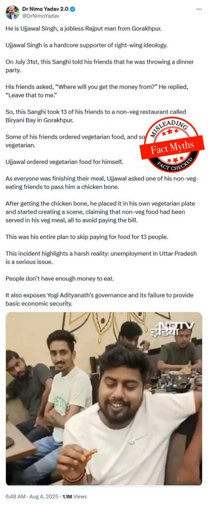 In August 2025 in Gorakhpur, a real incident occurred where a bone was found in the food at a restaurant. Local TV carried a 14‑minute video from the restaurant showing the argument and the bone itself. Nimo, however, constructed an elaborate fictional story: he claimed that Ujjawal Singh, a “jobless Sanghi Rajput”, had planted the bone in his vegetarian plate to skip paying the bill and used this fabricated anecdote to attack both the man and the wider Rajput community.