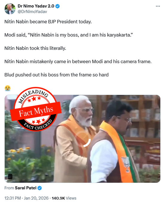 Another viral post from Nimo showed BJP president Nitin Nabin and Narendra Modi at a function, with the caption claiming that Nabin “mistakenly came in between Modi and his camera frame” and that Modi “pushed his boss from the frame so hard,” mocking their relationship.