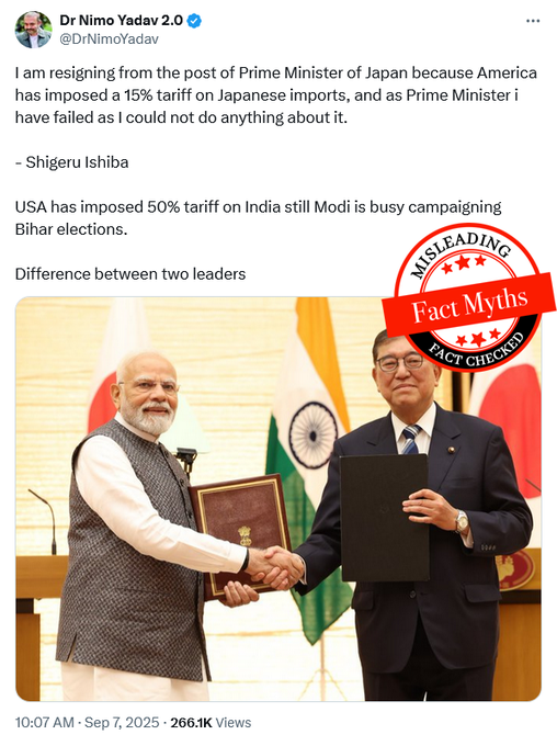 In reality, the Japanese PM’s resignation was tied to domestic electoral setbacks and internal party dynamics, not US tariffs, and there was no such 50% tariff episode on India matching the narrative. The quote attributed to Ishiba is not found in credible records; it is a fabricated contrast designed to demean India’s PM.