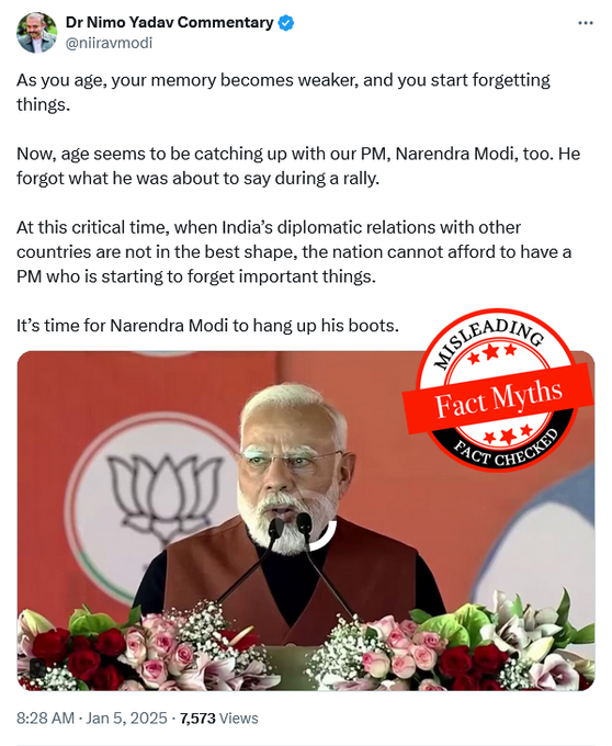 Nimo and its related handle (“Dr Nimo Yadav Commentary”) have repeatedly pushed the line that Narendra Modi is mentally unfit or senile. One post claimed Modi stopped his speech during a rally because the teleprompter failed, using it to argue that he is dependent and unfit to lead. Another suggested that age is “catching up” with Modi because he allegedly forgot what he was about to say, concluding “it’s time for Narendra Modi to hang up his boots.”