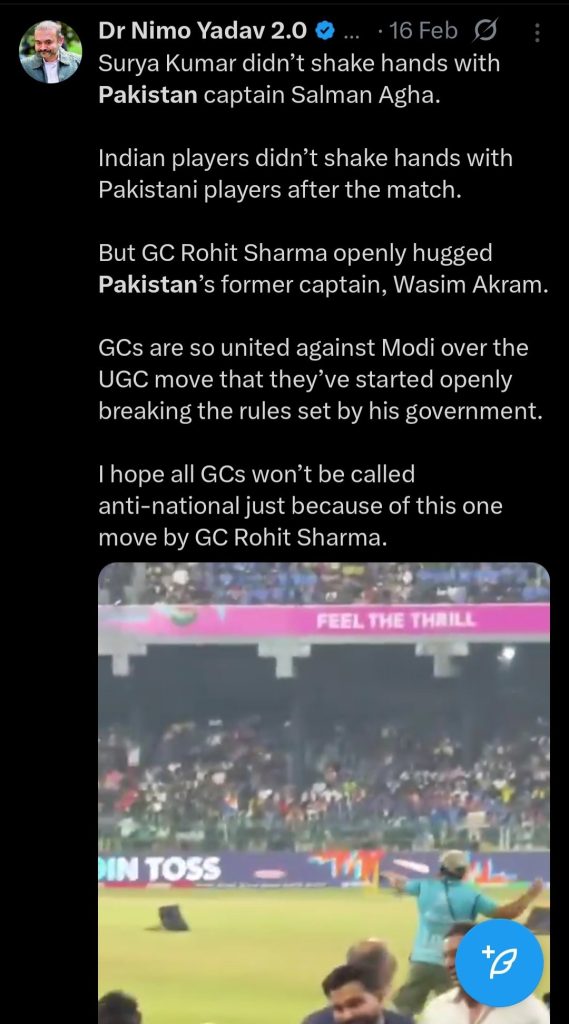 In another, he spun a routine, friendly on‑field interaction between Rohit Sharma and Wasim Akram into a story of “GCs” (general category Hindus) uniting against Modi and “breaking rules” in protest over a UGC move, implying that players were part of some caste‑political rebellion.