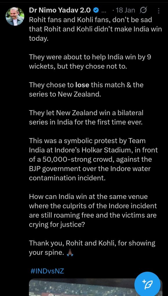 In one post, he claimed that Rohit Sharma and Virat Kohli deliberately lost a match against New Zealand as a symbolic protest against the BJP government over the Indore water contamination incident, thanking them for “showing spine”. There is zero evidence that Team India threw a match as political protest; it is fantasy packaged as insider information.